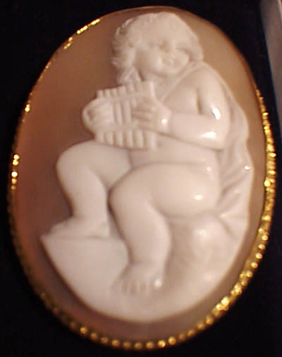 Super quality antique cameo brooch depicting a small child with panpipes, beautifully carved and set in a silver gilt mount.