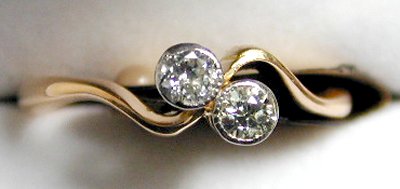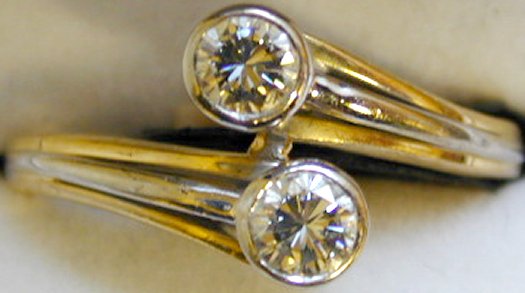18ct yellow and white gold modern 2 stone diamond set fancy twist style ring.  Diamond weight approx 0.56ct.