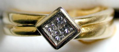 18ct unusual diamond set designer style ring with four centre diamonds.  Approx 4.5mm, diamond weight approx 0.25 carat.  Size N.