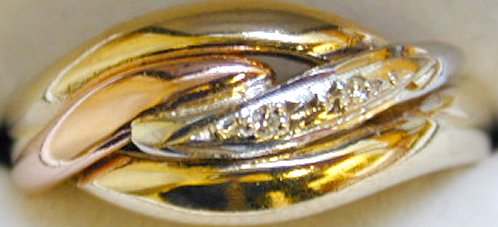 9ct yellow, white and rose gold ring set with 5 diamonds in the centre.  Size L 1/2, M 1/2.