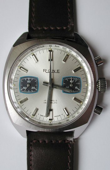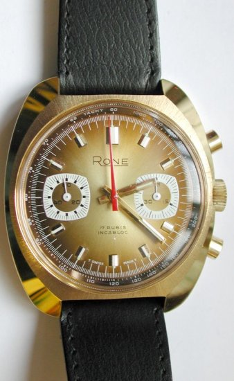 Brand new ex-shop stock, this gents chronograph was made by Rone in the 1970's. incorporating a tachometric display around the inside of the bezel,and a 17 jewel movement,Gold plated case with screw on steel case back. This watch also includes two subsidiary dials, one marking continual seconds and the other marking, forty five minute sectors, these are based at 9 and 3 o'clock respectively. With a sun-burst bronze tigers eye style dial, this watch has a highly desirable design.  It also incorporates applied gold luminescent tipped hands and a red tapering seconds marker.  This watch is of a style which is very much in fashion at the moment and a lot of the top brands are making watches in the 70's retro style again.
