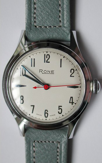 Brand new ex-shop stock, this 1960's gents analogue wrist watch was made in Switzerland by Rone in the 1960's.  Incorporating a silver dial, and black tapered luminous hands this watch comes complete with all of the original Rone box and guarantee papers.  The watch also incorporates an attractive red seconds hand that contrasts well with the rest of the watch.  With a silvered stainless steel head this watch is ideal for any occasion. An ideal buy and a very beautiful, yet simple watch.  This is one of 3 of the same watch we have available