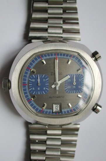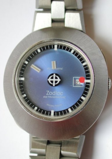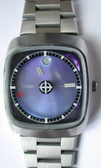 The hands are luminous and are set on two revolving 'plates' set under the watch glass. The watch on original stainless steel Zodiac chunky steel bracelet.