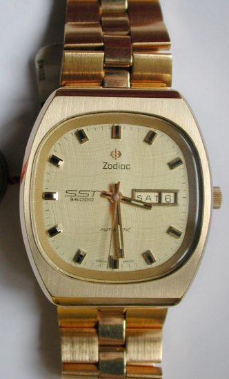Brand new ex-shop stock, this SST 36000 automatic watch, made by Zodiac in the 1970's, is extremely accurate. With an applied gold chunky strap and case, both carved from a single ingot of stainless steel - ensures both a high durability and an unmatched resistance to corrosion.