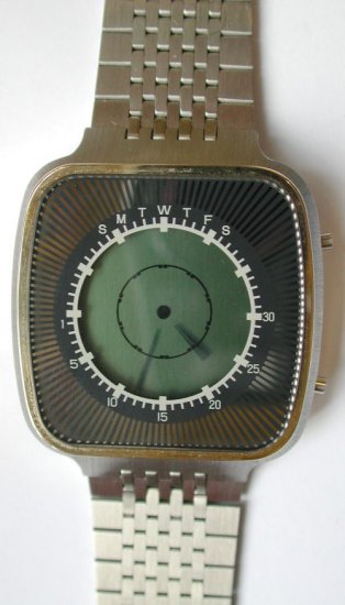 fasciae, that includes a gilt yellow-gold band around the outside.- This watch is an example of the first totally electronic quartz LCD analog watch which was introduced by TI in July, 1978. In addition to the time, day and date could be displayed. The combination of several technology firsts made the watch design practical.