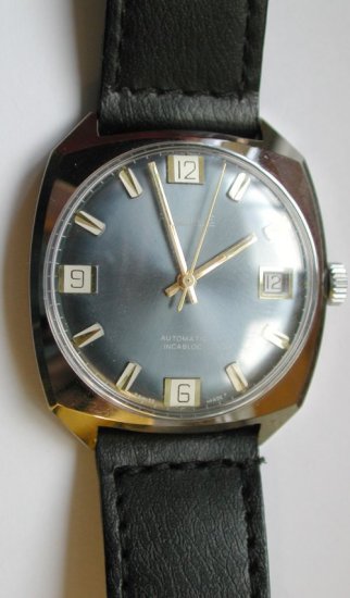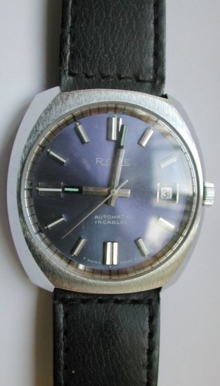 Brand new ex-shop stock, this 1970's Rone automatic self winding gents wrist watch, is incredibly stylish. Incorporating a black leather strap and a iridescent blue dial. With black and silvered luminous hands and hour marks that are emphasised at 12 and 6 o'clock.  Mounted at 3 o'clock is also a subsidiary date display making this yet another highly versatile watch.