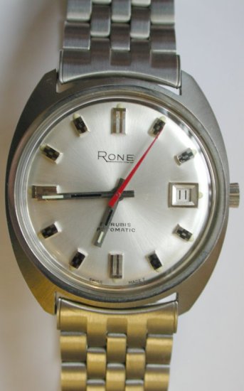 Brand new ex-shop stock, this 1970's automatic self winding Rone gents wrist watch, is carved from a single ingot of stainless steel. Incorporating a silvered face this watch used luminous and black hands to mark the passing hours and minutes.  Also the red seconds hand is designed with a taper leading away from the centre of the movement.  With black and luminous hour marks, this watch incorporates a subsidiary date display inset into the dial at 3 o'clock.
