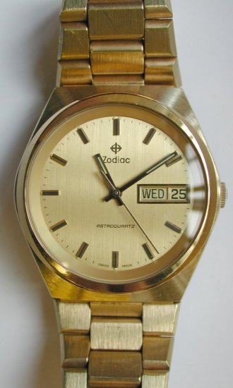 Brand new ex-shop stock, this 1970's chunky Zodiac Astroquartz, operating on a 32''768Hz Quartz Movement, comes with an applied gold case and bracelet - cut from a single ingot of stainless steel.  It also comes with a  day and date display set at 3 o'clock, that is easily legible and rapidly set by the watch crown. A very stylish watch - a very popular design by Zodiac, with an accuracy of +/- 1 minute per annum which equates to an accuracy of 99.9998%.